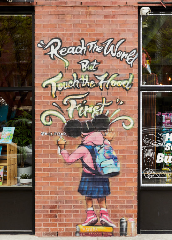 When I first announced The Lit. Bar’s concept, a lot of the responses I received were “books and wine? That is so white”. I know where those internalized sentiments come from, so I wanted to show my community that books and wine are not reserved for white people. We too deserve nice things in our community and we can do so while preserving the culture that already exists here. This inspired the store’s theme of graffiti and chandeliers to pay homage to the art form born here with a touch of sophistication. I carried that theme onto the shoes.